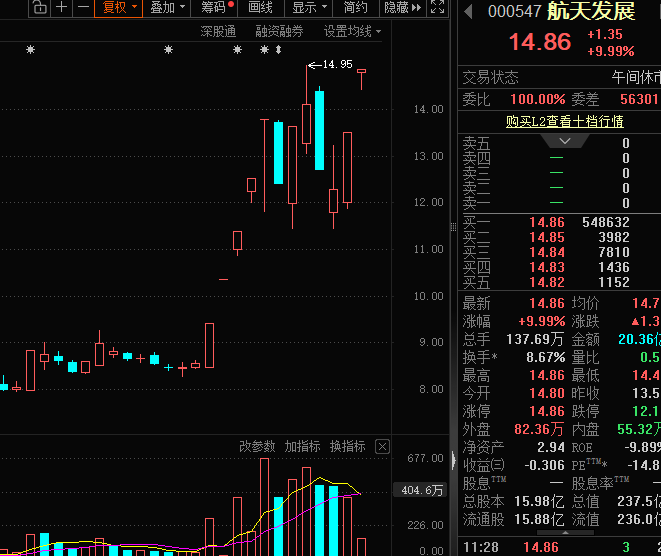 商业航天概念延续强势,航天发展(000547)一字板,斩获12天8板,星图测控、航天环宇等涨超10%,雷科防务、光启技术、利君股份等涨停,通宇通讯斩获3连板。