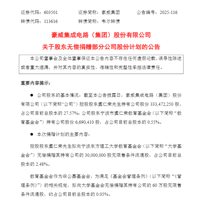12月2日晚间,豪威集团(603501)公告称,控股股东虞仁荣拟向宁波东方理工大学教育基金会(以下简称“大学基金会”)无偿捐赠其持有公司的3000万股无限售条件流通股,占公司目前总股本的2.48%。