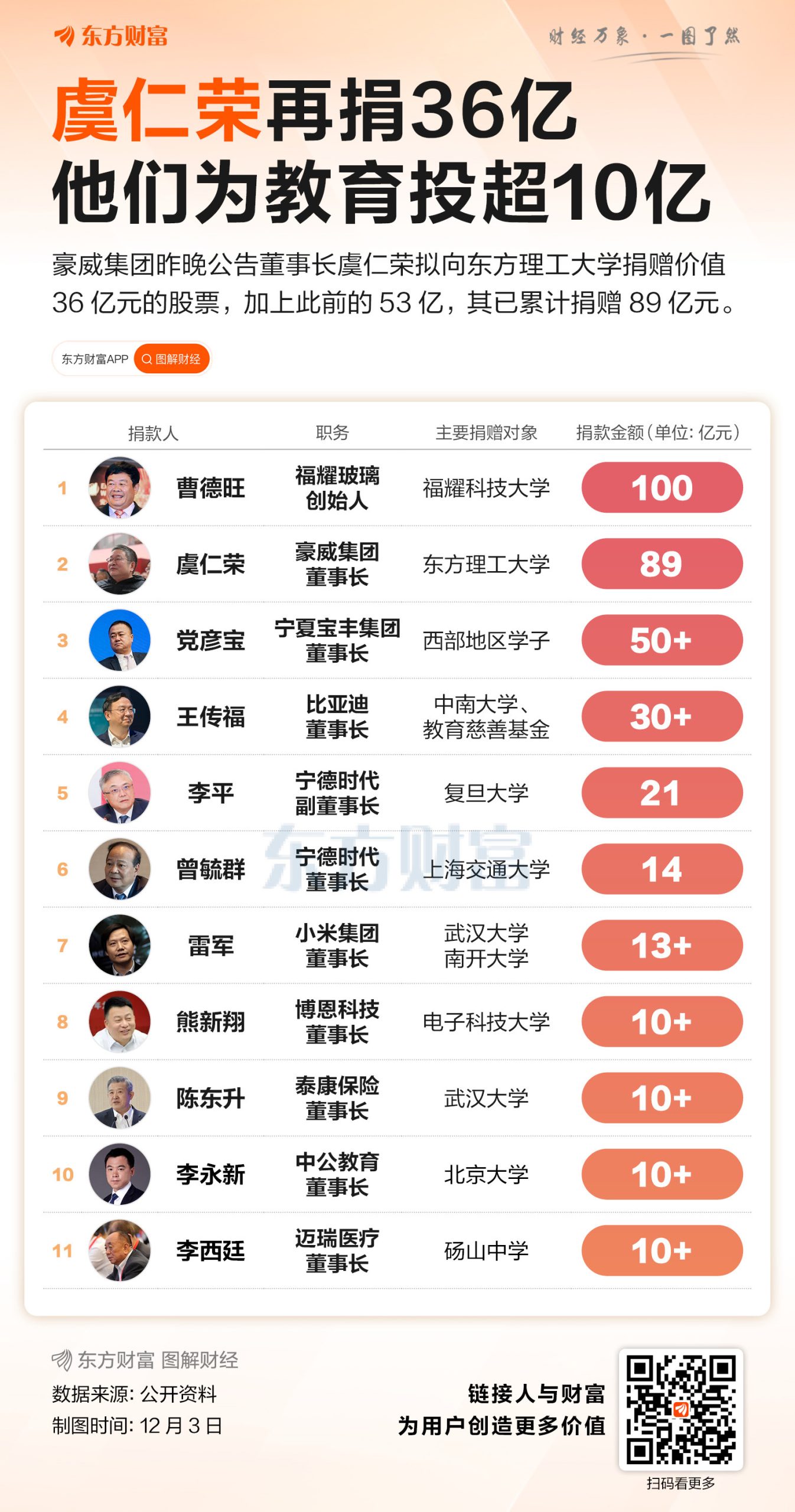 豪威集团12月2日晚公告称,控股股东虞仁荣拟向宁波东方理工大学教育基金会无偿捐赠其持有公司的3000万股无限售条件流通股。结合豪威集团当前股价,虞仁荣此次捐赠的股份价值约36亿元,至此,他已累计向东方理工大学捐赠89亿元。