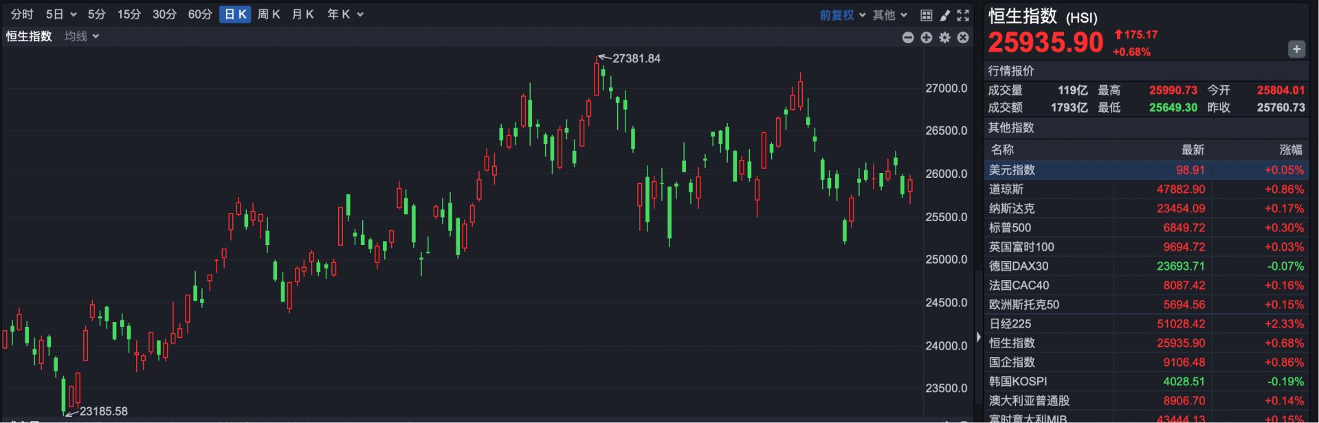 截至收盘,恒生指数报收于25935.90点,上涨175.17点,涨幅0.68%。成交量来看,今日全天仅成交1793亿港元,较昨日略有增长。