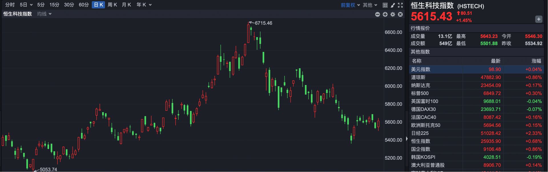 恒生科技指数报收于5615.43点,上涨80.51点,涨幅1.45%。