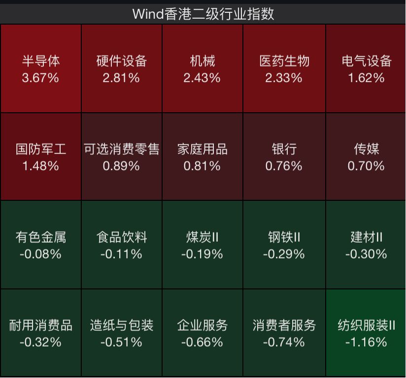 板块方面,截至收盘,半导体、硬件设备、医药生物等板块强势走高。半导体方面,英诺赛科(HK02577)涨近5%,中芯国际(HK00981)涨超4%,华虹半导体(HK01347)涨超3%,上海复旦(HK01385)涨超2%。硬件设备方面,机器人相关个股表现强势,地平线机器人-W(HK09660)涨近7%,德昌电机控股(HK00179)涨超6%,微创机器人-B(HK02252)涨超5%。医药生物方面,药明系领涨,药明合联(HK02268)、药明生物(HK02269)涨超7%,药明康德(HK02359)涨超6%。