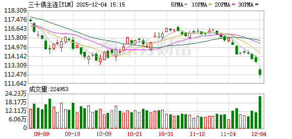 12月4日,银行间主要利率债收益率升幅扩大,30年期国债“25超长特别国债06”收益率上行1.5bp报2.2510%,10年期国开债“25国开15”收益率上行1.7bp报1.9350%,10年期国债“25附息国债16”收益率上行1bp报1.8475%。30年国债期货一度杀跌近1%。