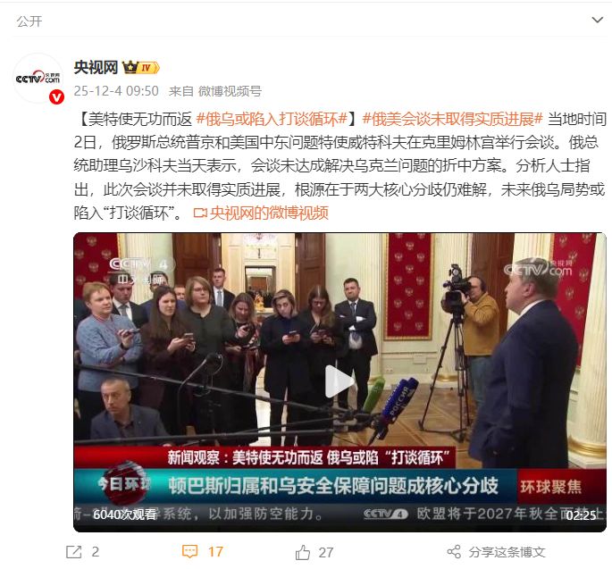 据央视网官方微博12月4日消息,当地时间12月2日,俄罗斯总统普京和美国中东问题特使威特科夫在克里姆林宫举行会谈。俄总统助理乌沙科夫当天表示,会谈未达成解决乌克兰问题的折中方案。分析人士指出,此次会谈并未取得实质进展,根源在于两大核心分歧仍难解,未来俄乌局势或陷入“打谈循环”。