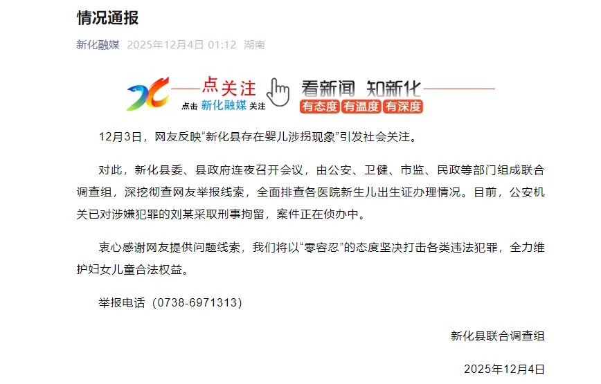 12月4日凌晨,湖南省娄底市新化县联合调查组发布情况通报:12月3日,网友反映“新化县存在婴儿涉拐现象”引发社会关注。对此,新化县委、县政府连夜召开会议,由公安、卫健、市监、民政等部门组成联合调查组,深挖彻查网友举报线索,全面排查各医院新生儿出生证办理情况。目前,公安机关已对涉嫌犯罪的刘某采取刑事拘留,案件正在侦办中。衷心感谢网友提供问题线索,我们将以“零容忍”的态度坚决打击各类违法犯罪,全力维护妇女儿童合法权益。举报电话(0738-6971313)。