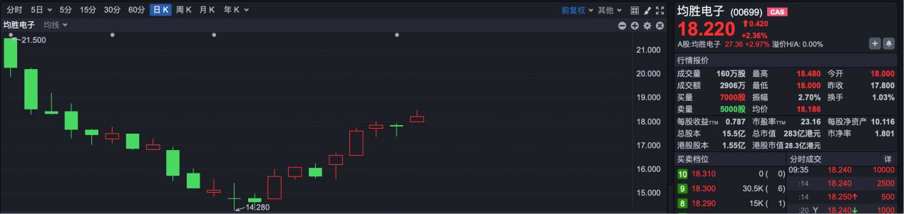 均胜电子H股于11月6日在港交所上市交易,发行价为22港元,上市之后一度跌至14.28港元。截至今日发稿,均胜电子H股报18.22港元。