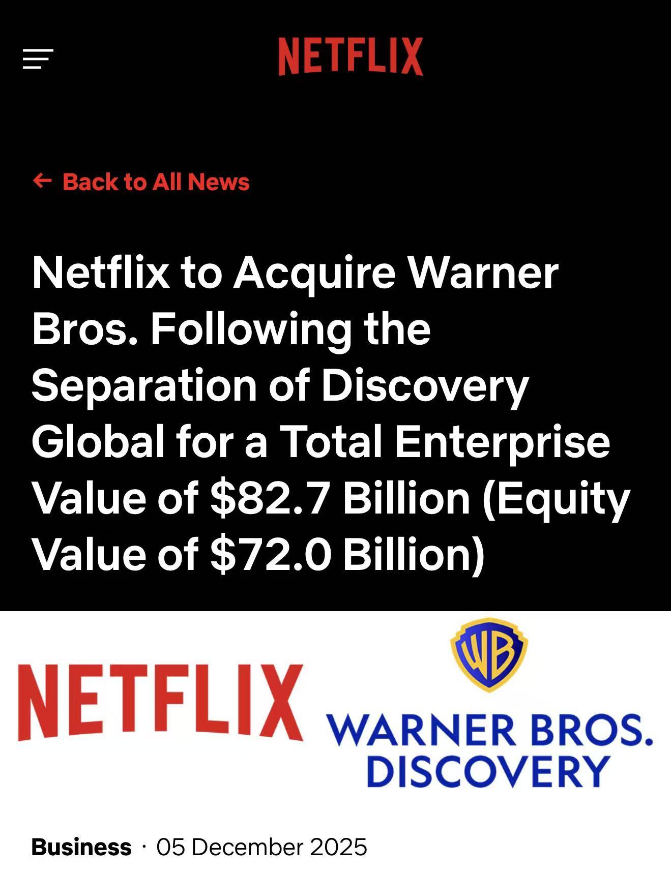 据悉,包括派拉蒙、康卡斯特在内的多家公司也曾表达兴趣,但最终Netflix凭借现金加股票的组合方案胜出。更关键的是,它不仅给出了更高的总价,还承诺让WBD股东同时持有Netflix股票和新成立的Discovery Global股份,从而在长期价值上更具吸引力。