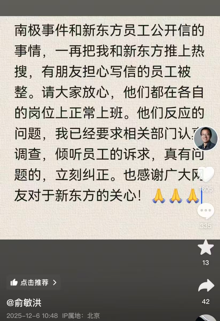 12月6日,新东方集团董事长俞敏洪发文:南极事件和新东方员工公开信的事情,一再把我和新东方推上热搜,有朋友担心写信的员工被整。请大家放心,他们都在各自的岗位上正常上班。他们反映的问题,我已经要求相关部门认真调查,倾听员工的诉求,真有问题的,立刻纠正。