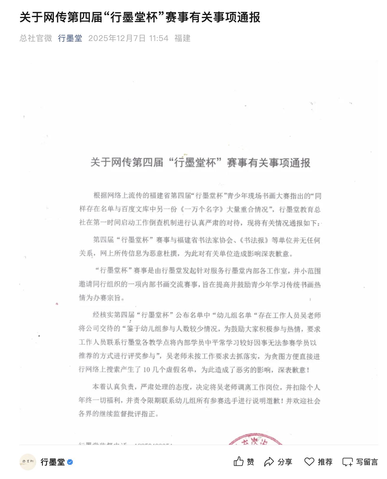 12月7日,上述书画大赛主办方行墨堂教育咨询有限公司发布通报,公开回应此事。该公司称,经核实,因赛事中幼儿组参与人数较少,为鼓励大家积极参与,公司要求工作人员联系各教学点,将部分学习较好但因事无法参赛的学员以推荐的方式参赛评奖。“但工作人员吴老师却未落实工作要求,为贪图方便,直接通过网络搜索的方式产生了十几个虚假名单,因此造成了恶劣影响。”