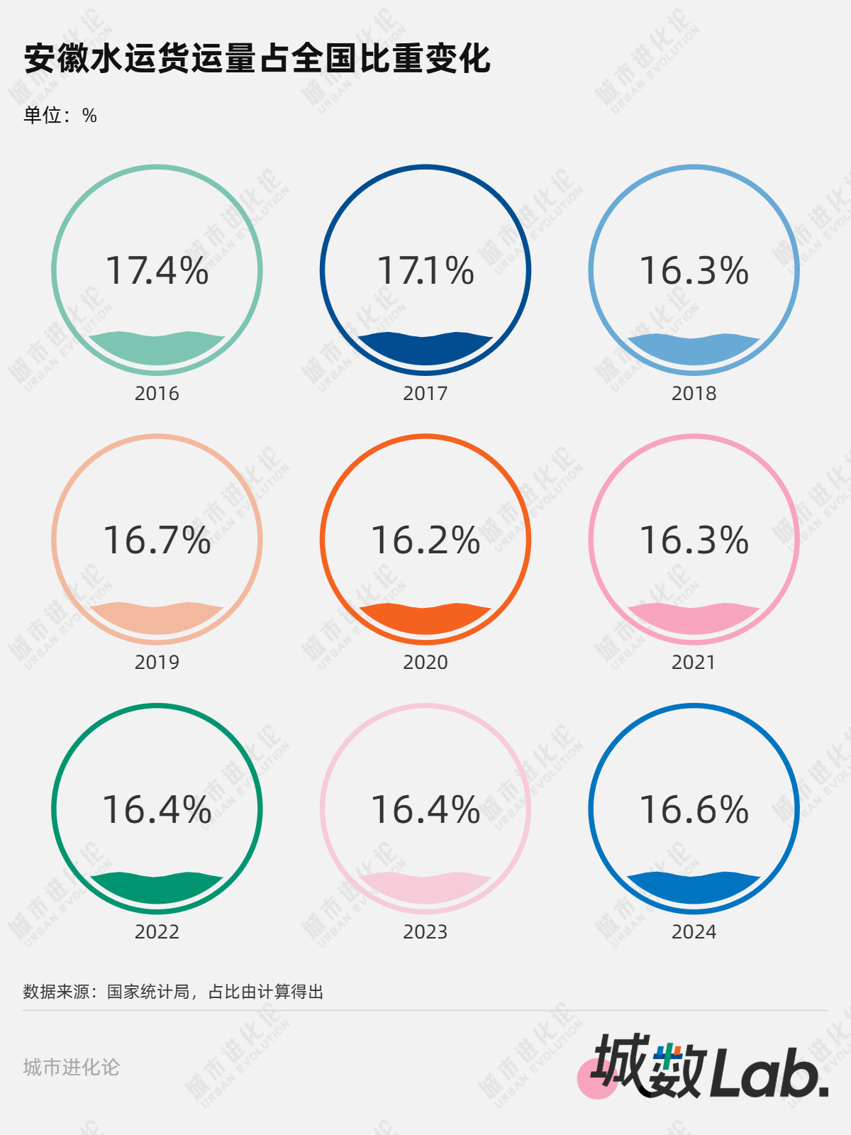 不过过去10年间,全国各地发力竞逐水运赛道,安徽虽水运货运量绝对值保持领先,但其全国占比出现小幅下滑。