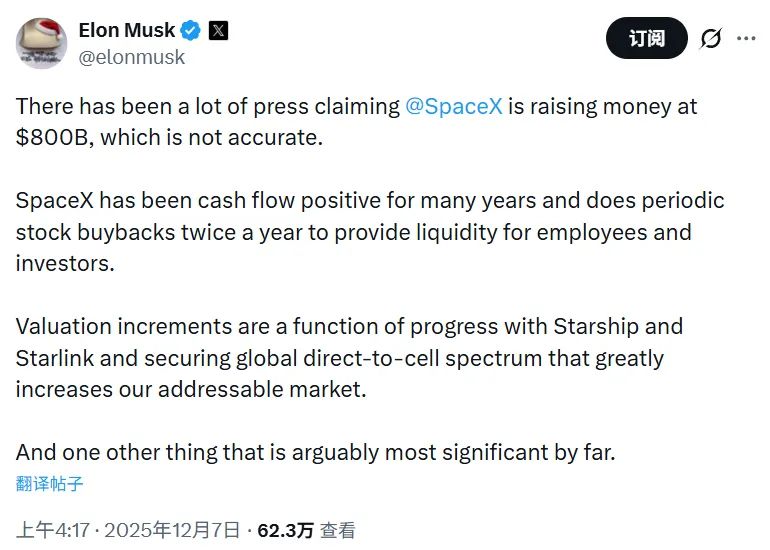 他在社交媒体上发帖称,SpaceX以8000亿美元估值融资的消息“并不准确”(not accurate)。