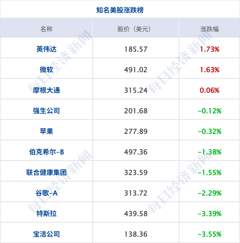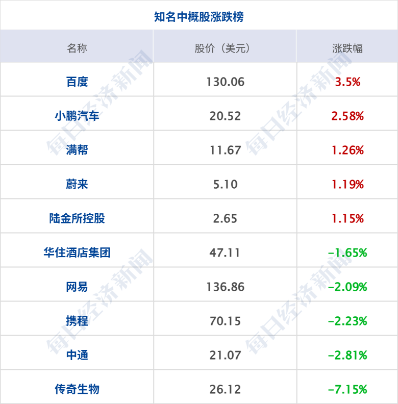 美股三大指数集体收跌,道指跌0.45%,纳指跌0.14%,标普500指数跌0.35%,大型科技股多数下跌,特斯拉跌超3%,谷歌跌逾2%,亚马逊跌超1%,脸书跌近1%,苹果跌0.32%;微软、英伟达涨超1%。纳斯达克中国金龙指数涨0.08%,中概股涨跌不一,高途、世纪互联涨超4%,百度、名创优品涨超3%,小鹏汽车、新东方涨超2%,网易跌超2%,爱奇艺跌近1%。