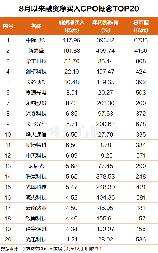 东方财富Choice数据显示,自今年8月以来,杠杆资金抢筹多只CPO概念股,融资净买入排名前20个股合计净买入超377亿元。