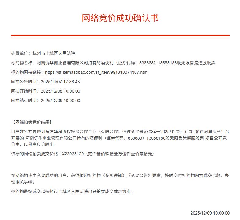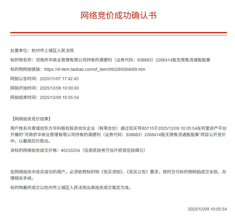 2025年12月9日10时,淘宝网司法拍卖平台上关乎酒便利控制权的争夺战结果出炉:杭州市上城区人民法院公开处置的控股股东河南侨华商业管理有限公司(下称“河南侨华”)所持3831.21万股股份,被共青城创东方华科股权投资合伙企业(有限合伙)(下称“创东方华科”)竞得。
