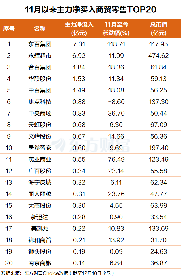 具体来看,东百集团排名第一,主力净买额超7亿元;永辉超市排名第二,主力净买额6.9亿元。