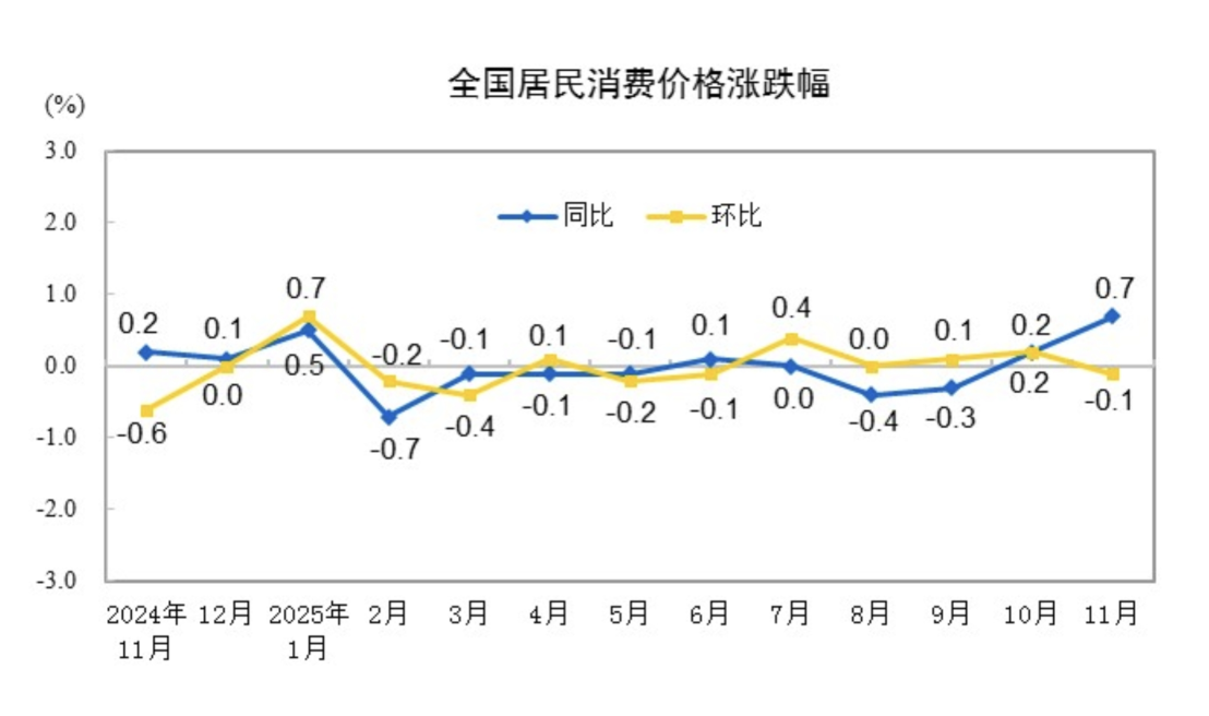 11月CPI同比上涨0.7%,为2024年3月份以来最高。