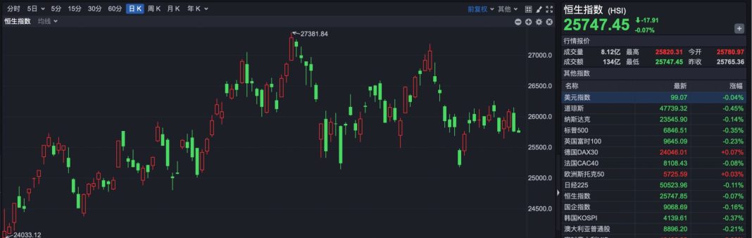 截至发稿,恒生指数报25747.45点,下跌17.31点,跌幅0.07%。