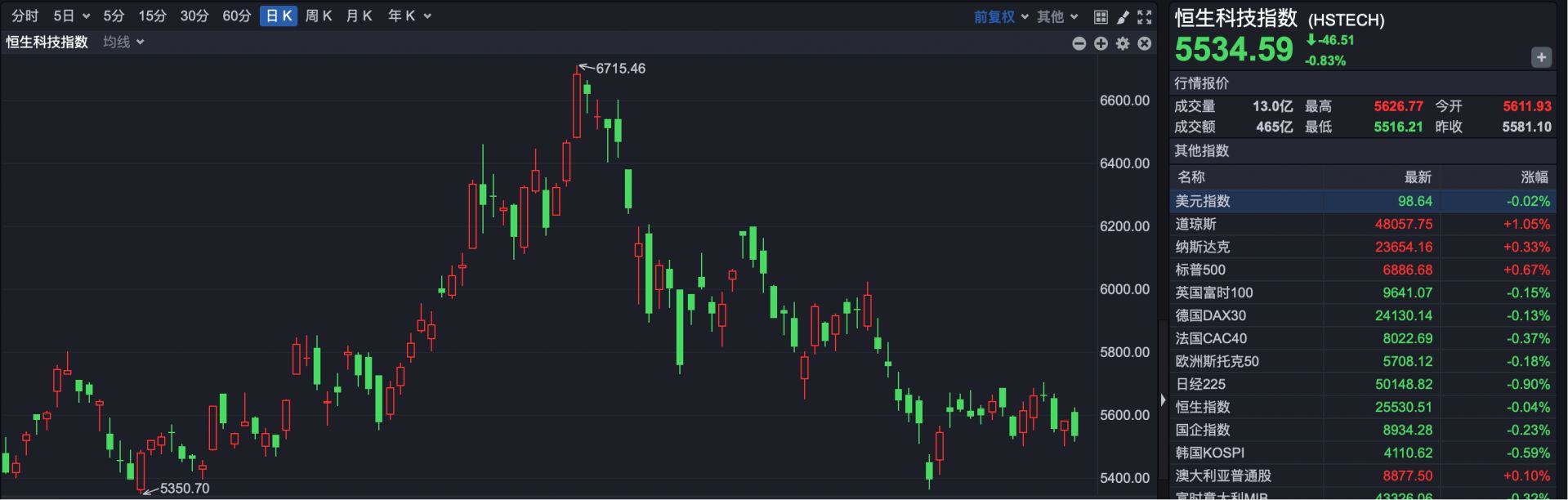恒生科技指数收报5534.59点,下跌46.51点,跌幅0.83%。