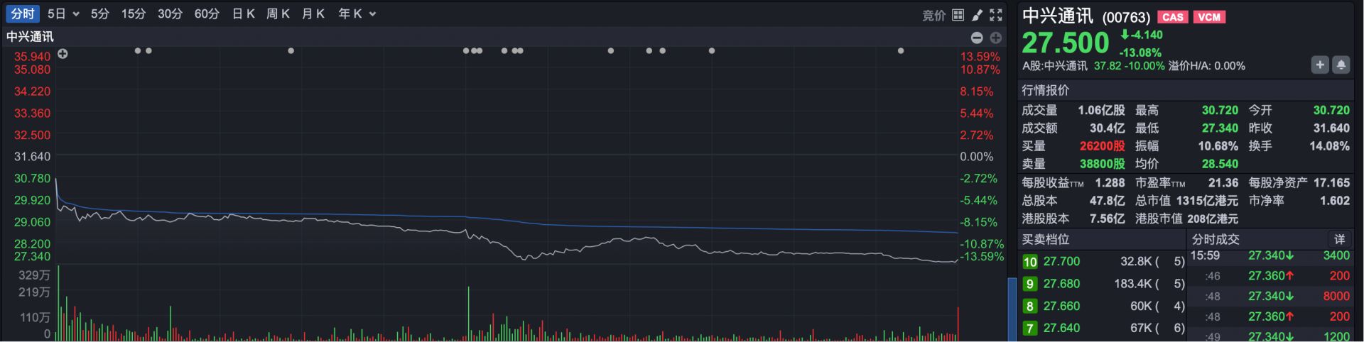焦点公司方面,中兴通讯(HK00763)突发大跌,截至收盘,股价跌超13%。同时,中兴通讯A股(SZ000063)也以跌停报收。