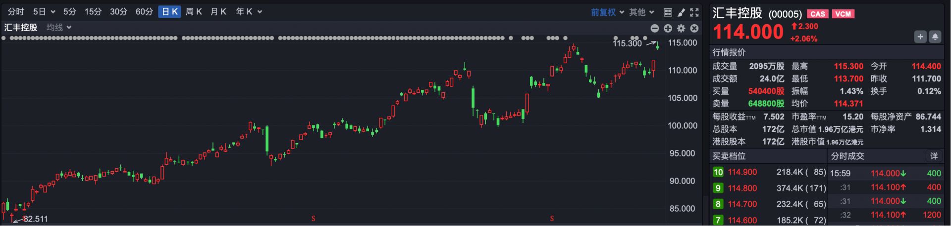 其中,汇丰控股(HK00005)一度涨超3%,并以115.3港元的价格创出历史新高,最终收盘上涨2.06%。此外,其他银行股中,渣打集团涨超1%,东亚银行、中银香港、恒生银行跟涨。
