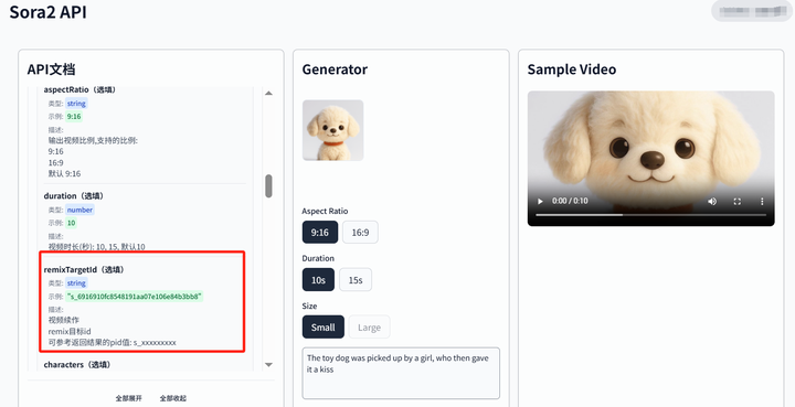 1.核心参数 remixTargetId:这是 Remix 功能的关键,必须填入源视频的唯一标识 pid(格式通常为 s_xxxxxxxxxxxxxxx)。此 pid 可在视频第一次生成的成功响应中获取。