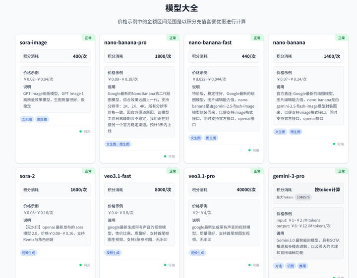 GrsAI 具备企业级服务的稳定性,在低价格的同时保证高成功率和全球可用性使其能够支撑大型商业项目。不仅提供 Sora2 的接入通道,作为一个综合性的 AI API 聚合平台,它还提供如 Nano Banana flase(图像生成)、Nano Banana Pro 、GPT-4o、Veo3.0/Veo3.1(视频生成)、Gemini 3(文本生成)等多种主流模型的统一调用入口。这为开发者构建复杂的多模态 AIGC 工作流提供了极大便利,避免了在多个平台间切换和管理密钥的麻烦。