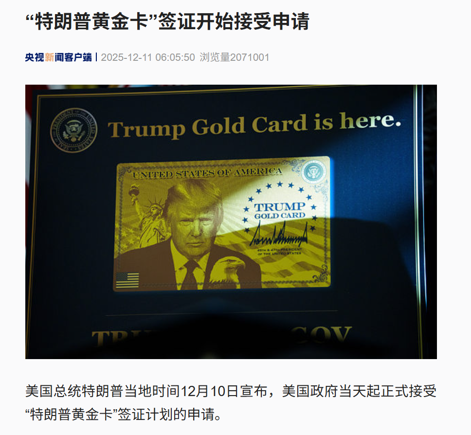 据央视新闻报道,美国总统特朗普当地时间12月10日宣布,美国政府当天起正式接受“特朗普黄金卡”签证计划的申请。