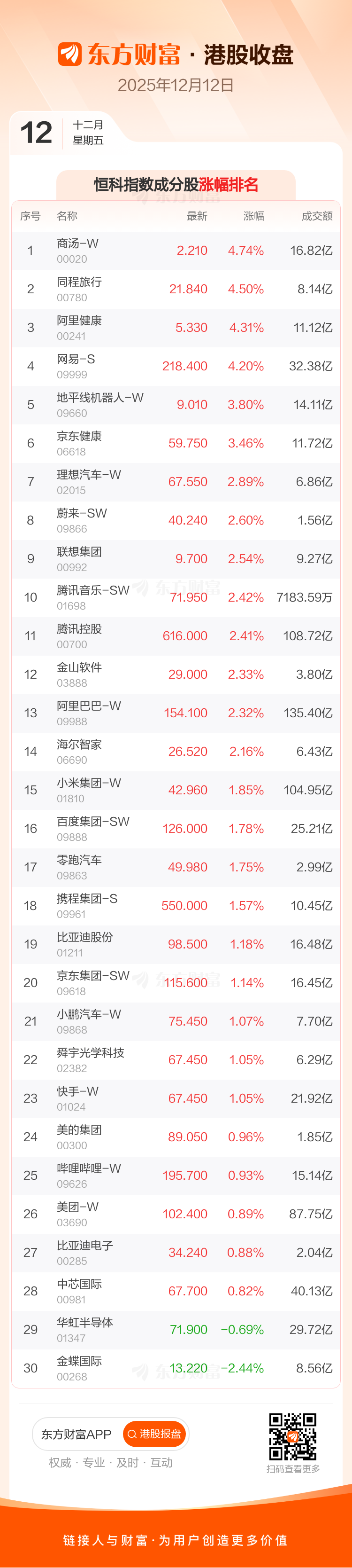 港股12月12日收盘走高,恒生指数收报25976.79点,涨446.28点,涨幅1.75%;恒生科技指数收报5638.05点,涨103.46点,涨幅1.87%。恒生指数成分股中中国人寿、长江基建集团、中通快递-W涨幅居前,翰森制药、百威亚太、东方海外国际跌幅靠前。恒生科技指数成分股中商汤-W、同程旅行、阿里健康涨幅居前,金蝶国际、华虹半导体、中芯国际跌幅靠前。