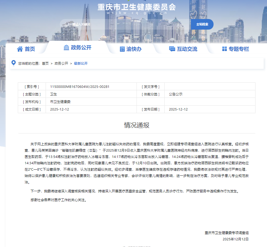 出院后,患方反映治疗药物诺西那生钠说明书记载该药物应在2℃-8℃下冷藏保存,不得冷冻,认为注射药疑似失效。经初步调查,当事医生存在违规存储药物情况,重庆市卫生健康委将依法依规对其进行严肃处理,始终以保护患儿健康和积极救治为首要原则,迅速组织相关专业专家,会诊评估对患儿病情的影响,进一步制定治疗方案,及时给予患儿专业规范救治。
