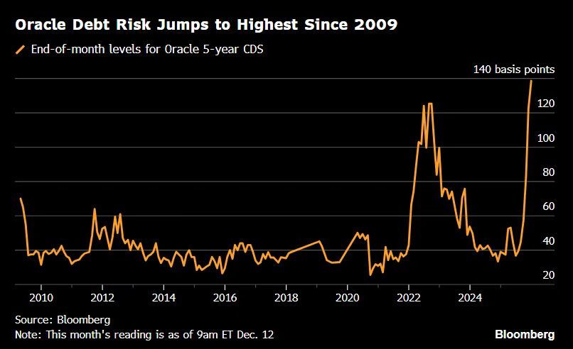 截至12月12日,甲骨文五年期信用违约掉期已升至2009年以来最高点