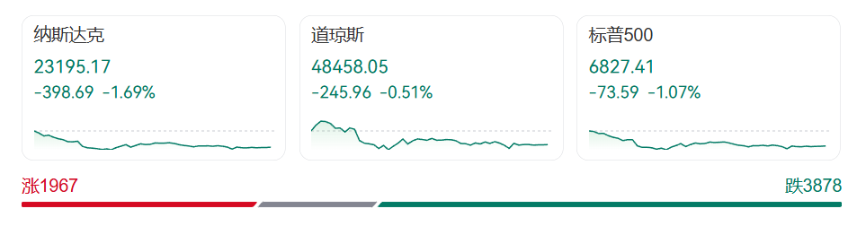 当地时间12月12日,美股三大指数集体收跌,道指跌0.51%,本周累计上涨1.05%;纳指跌1.69%,本周累计下跌1.62%;标普500指数跌1.07%,本周累计下跌0.63%。超3800股下跌。