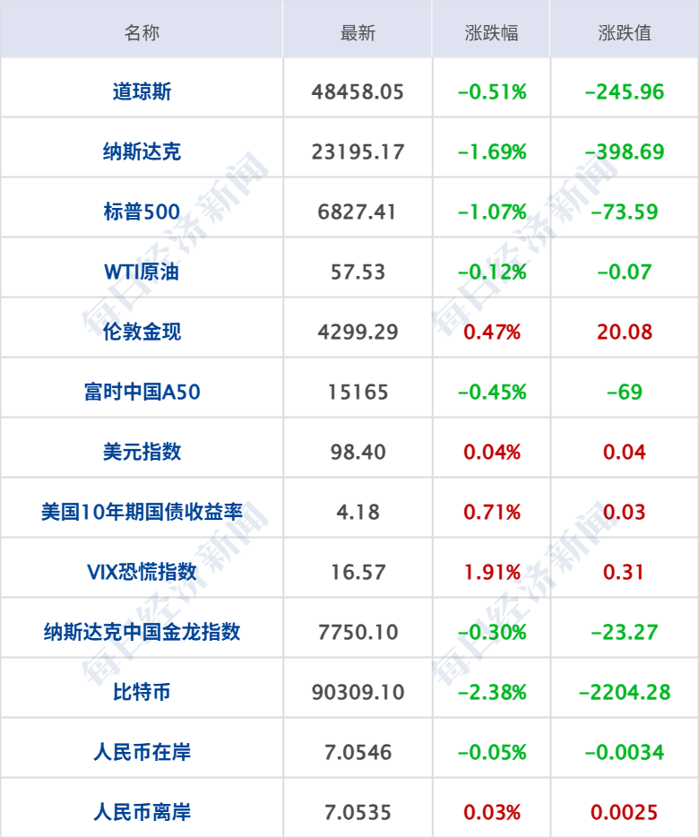美股三大指数集体收跌,道指跌0.51%,纳指跌398.69点,跌幅1.69%,标普500指数跌1.07%,热门科技股普跌,博通跌超11%,英伟达跌超3%,谷歌、微软、Meta、亚马逊均跌超1%,特斯拉涨超2%;存储概念股、加密矿企、半导体板块跌幅居前,康宁跌近8%,昆腾跌超7%,美光科技、戴尔科技、罗技跌超6%,超微电脑跌近5%,英特尔跌超4%,惠普跌超2%;汽车制造板块上涨,极星汽车涨超19%,Rivian涨超12%,丰田汽车涨超2%。纳斯达克中国金龙指数跌0.3%,中概股多数下跌,好未来涨超3%,新东方、网易涨超2%,百胜中国、知乎涨超1%,哔哩哔哩跌超1%,百度跌超2%,爱奇艺跌超4%。