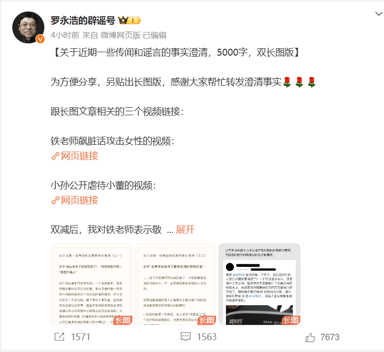 罗永浩今日通过微博“罗永浩的辟谣号”发布五千字长文,对近期的部分谣言和传闻作事实澄清。在此之前,一位自称是俞敏洪20多年的好友“张翔”,突然发文曝光了罗永浩的五宗罪。