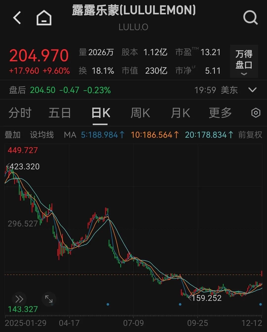 受上述消息影响,当地时间12月12日,lululemon股价收盘上涨9.6%。值得一提的是,lululemon股价年内最大跌幅一度超52%,目前仍下跌46.40%,市值蒸发约197亿美元。