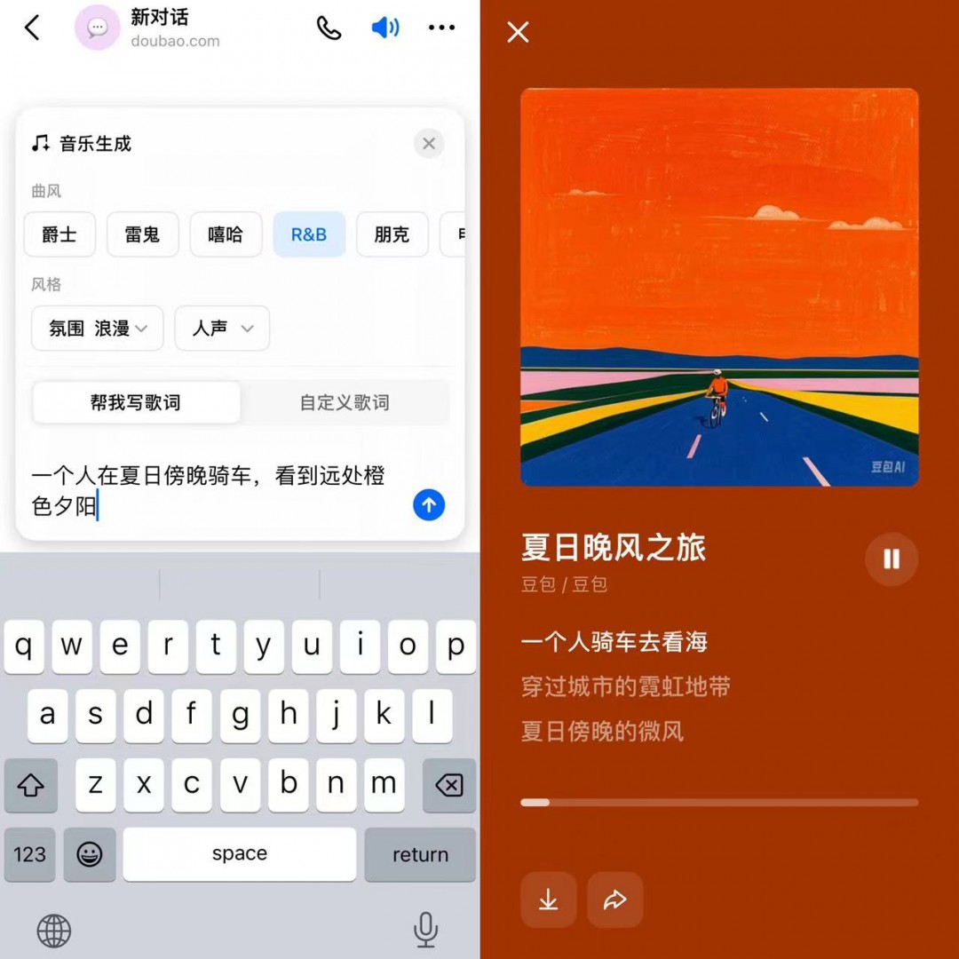 例如,在一次骑行之后,输入“一个人在夏日傍晚骑车,看到远处橙色夕阳”的描述,设定“R&B”风格与“浪漫”情绪,豆包就会自动撰写和生成一段相关的音乐和歌词,并根据歌词自动生成歌曲封面。同时,歌曲还支持一键分享至抖音等社交平台。