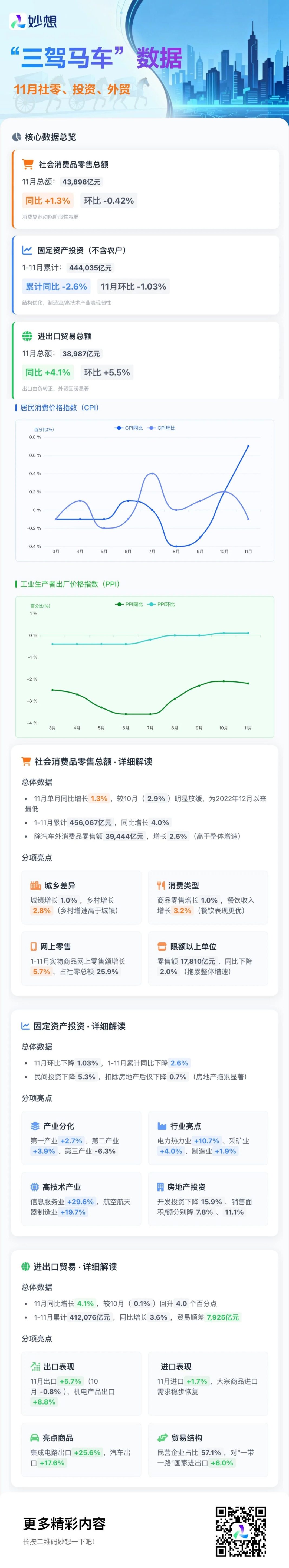 12月15日, 官方发布了我国11月 “三驾马车”(社会消费、固定资产投资、进出口贸易)的经济数据,整体看,11月经济呈现 “外贸回暖、投资结构优化、消费弱复苏” 的特点。
