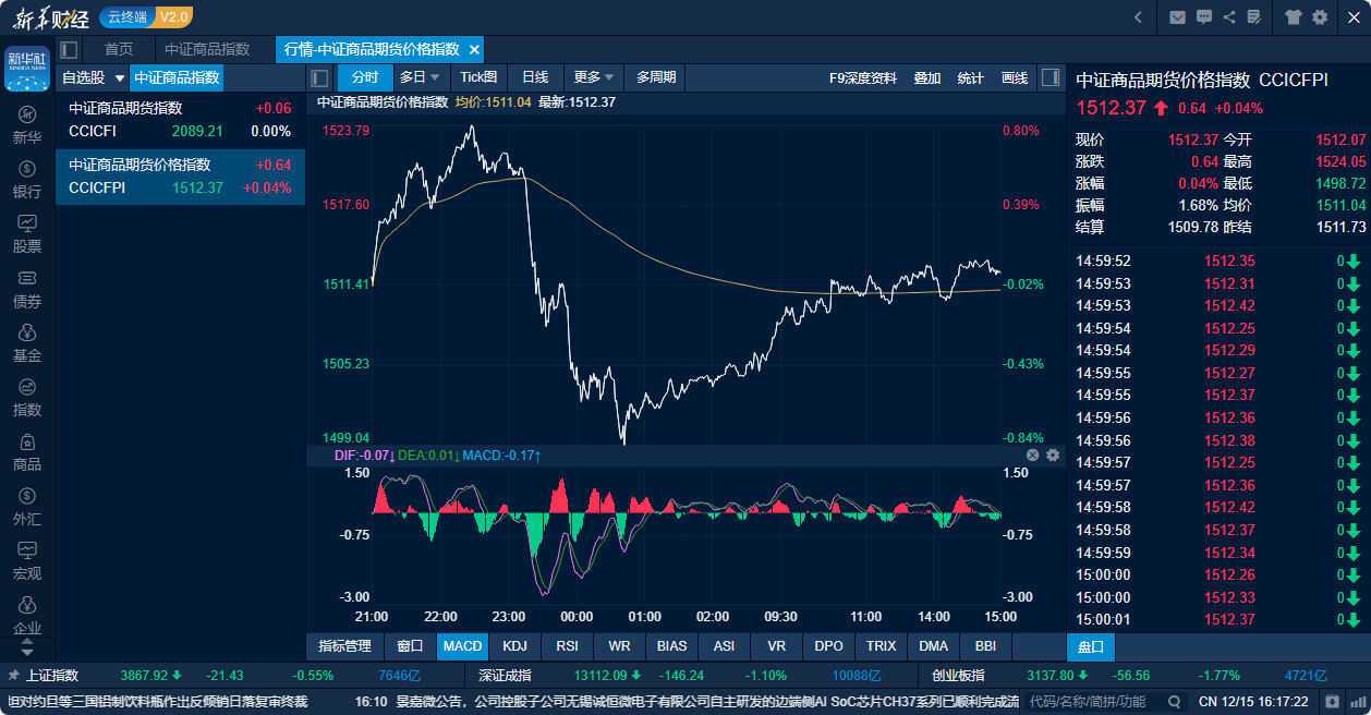 12月15日,国内商品期货市场整体震荡趋强。截至收盘时,中证商品期货价格指数收报1512.37点,较前一交易日上涨0.64点,涨幅0.04%;中证商品期货指数收报2089.21点,较前一交易日上涨0.06点,涨幅0%。