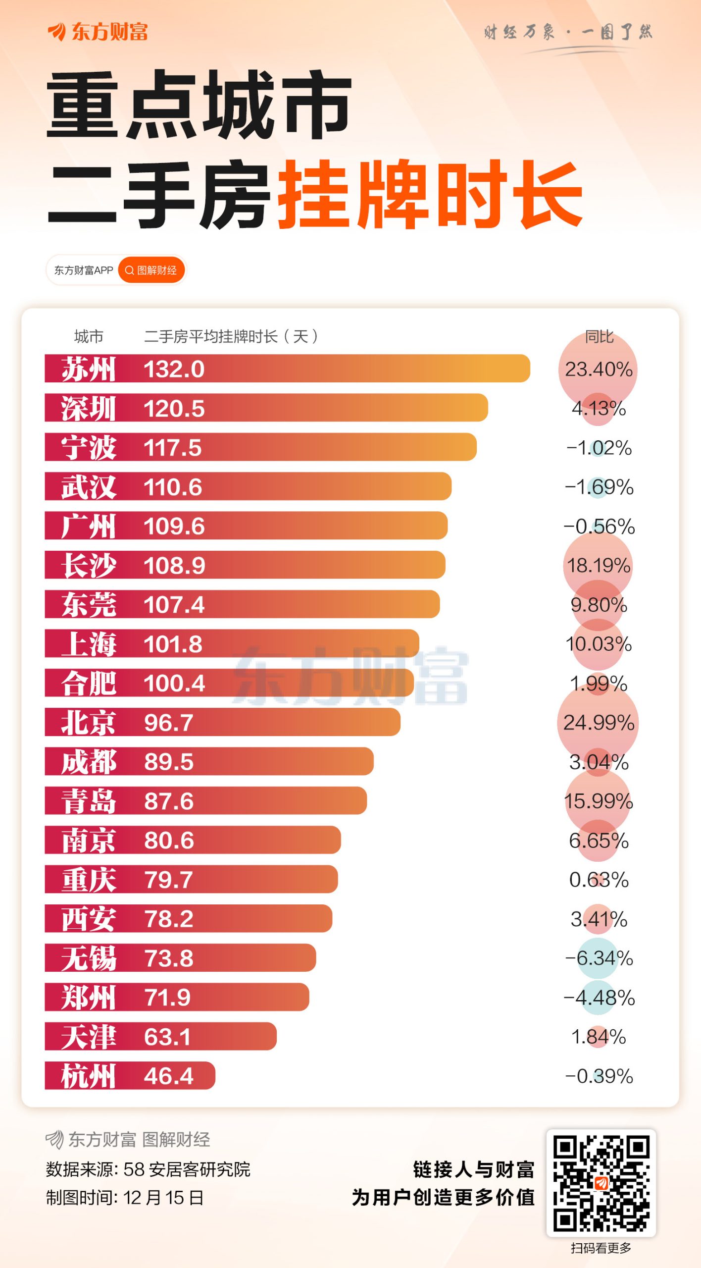 二手房流动性放缓态势延续。据58安居客研究院近日发布的《2025年11月二手房市场月报》,当月一线及新一线城市二手房平均挂牌时长多数增加。其中,北京同比增幅最大,达24.99%,苏州次之,同比增长23.4%;长沙同比增长18.2%,位列第三;青岛、上海也均同比增超10%。