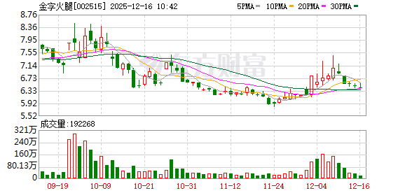 12月15日,金字火腿收盘价为6.49元/股,跌幅0.76%,市值为78.57亿元。