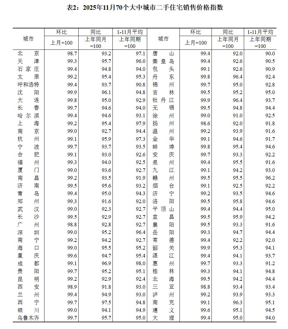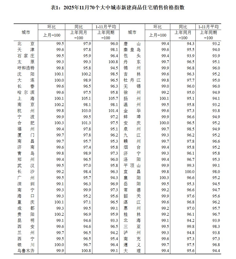 2025年11月份,70个大中城市商品住宅销售价格环比总体下降、同比降幅扩大。