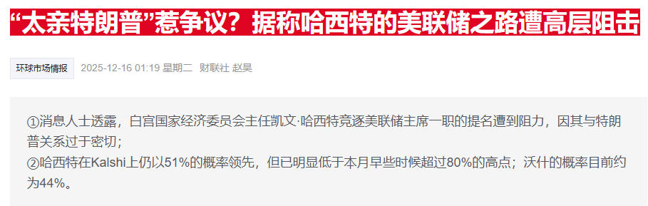财联社前一天报道提到,哈西特的候选资格曾被市场视为几乎板上钉钉,但现在却遭到一些与特朗普关系密切的高层人士的反对。