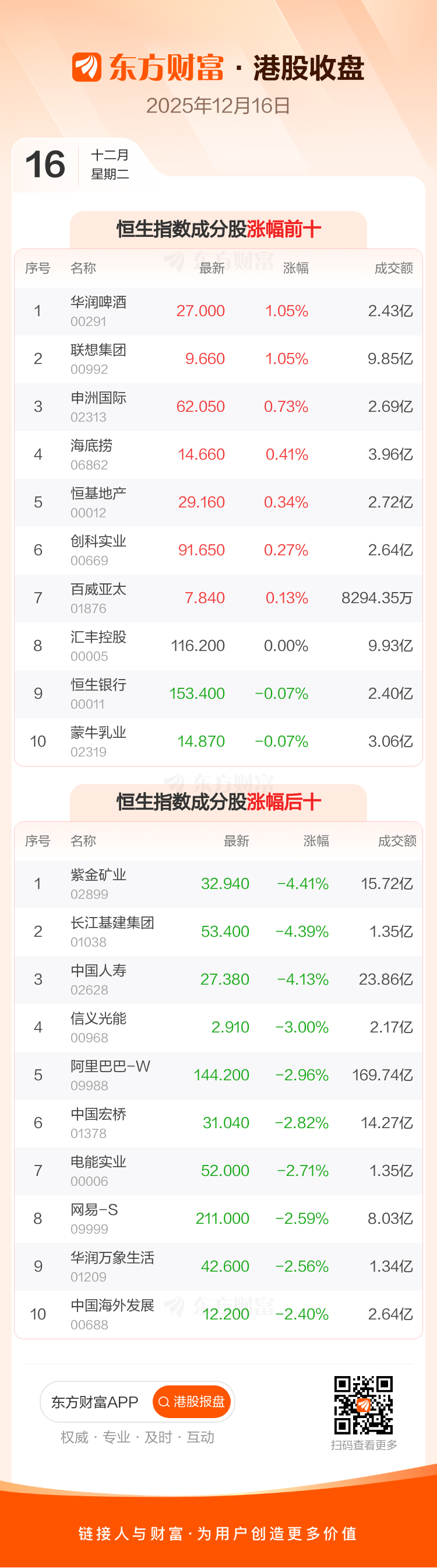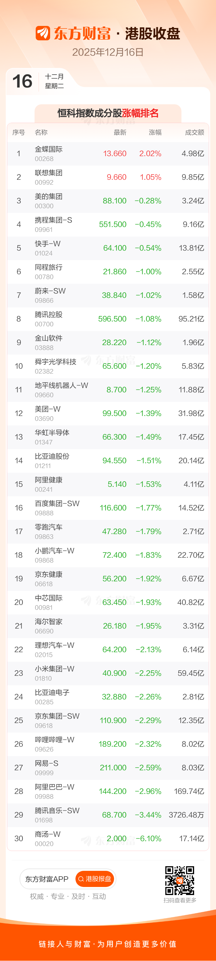 港股12月16日收盘走低,恒生指数收报25235.41点,跌393.47点,跌幅1.54%;恒生科技指数收报5402.51点,跌95.91点,跌幅1.74%。恒生指数成分股中华润啤酒、联想集团、申洲国际涨幅居前,紫金矿业、长江基建集团、中国人寿跌幅靠前。恒生科技指数成分股中金蝶国际、联想集团、美的集团涨幅居前,商汤-W、腾讯音乐-SW、阿里巴巴-W跌幅靠前。