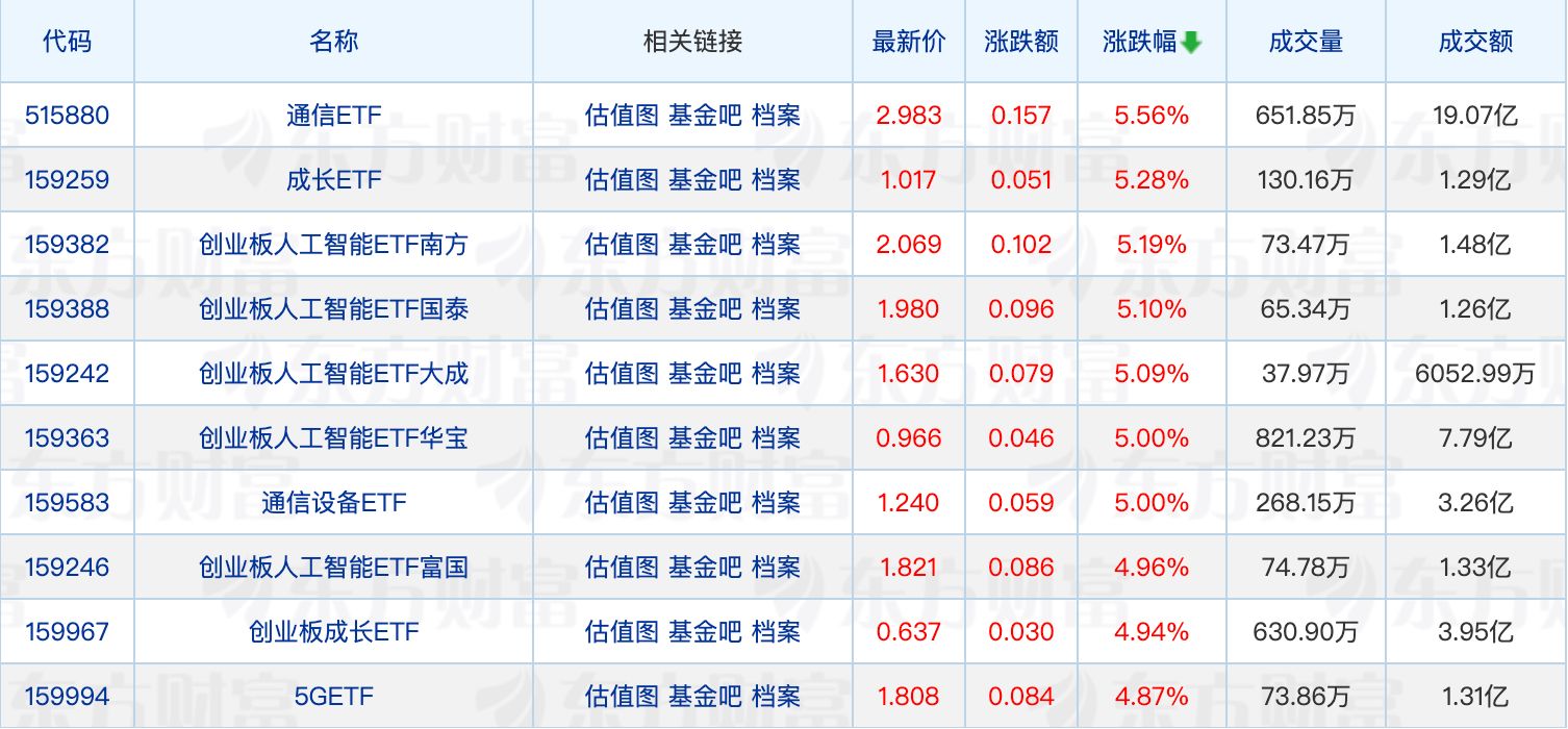 ETF涨跌幅方面,通信、人工智能相关ETF涨超5%。