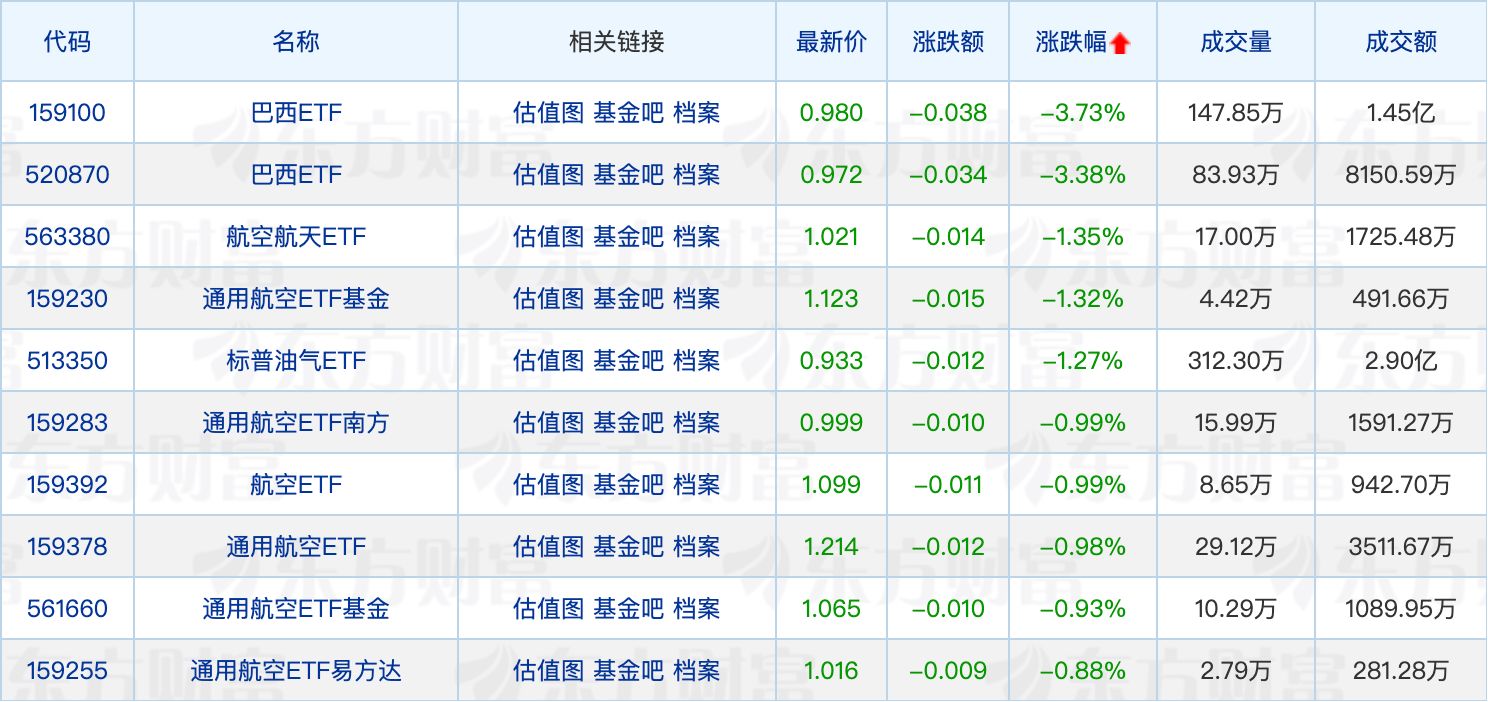 下跌方面,巴西ETF跌超3%,航天相关ETF跌约1%。