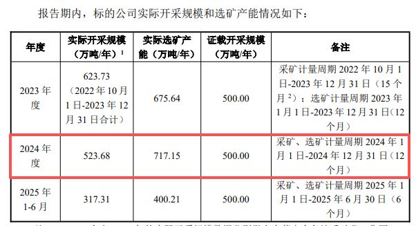此外,标的公司在2023年和2024年均存在实际采矿规模超过采矿证证载规模的情况。例如,其2024年全年实际开采523.68万吨,但证载仅500万吨。