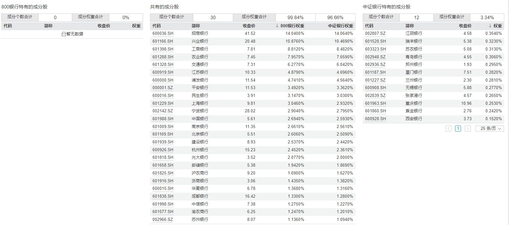 进一步对比两个指数的成分股,可以看到两个指数共有的成分股是30只,也就是说,中证银行指数的成分股完全包含了中证800银行指数的成分股,同时中证银行指数还有12只独有的成分股,如江阴银行、瑞丰银行等。