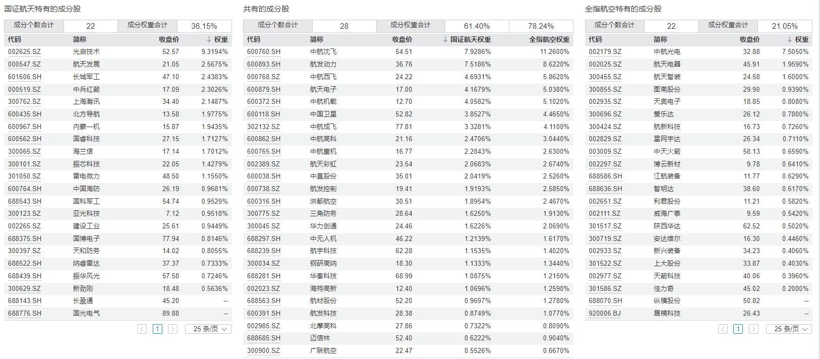 进一步对比两个指数的成分股,可以发现两个指数共有的成分股是28只,各自独有的成分股是22只。其中,国证航天航空行业指数独有的成分股包括光启技术、航天发展、长城军工等,中证全指航空航天指数独有的成分股包括中航光电、航天电器、航天智装等。