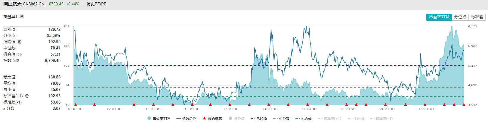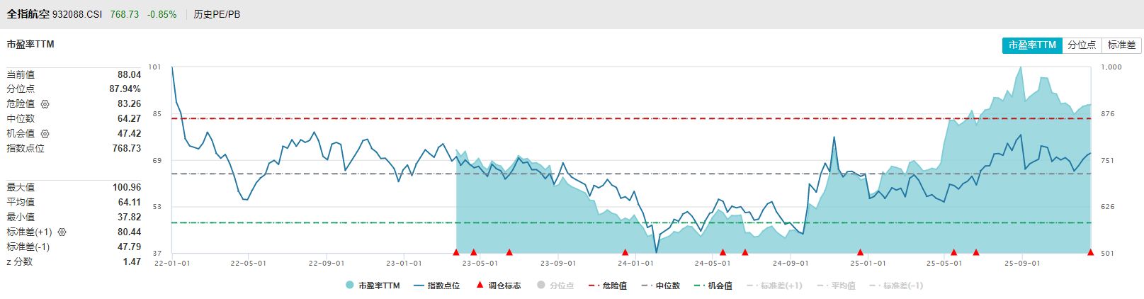 接着看两个指数目前的估值水平,Wind数据显示,国证航天航空行业指数目前的市盈率TTM回升到了近十年90%分位以上,属于较高位置。中证全指航空航天指数目前的市盈率TTM也回升到接近90%的分位,不过中证全指航空航天指数过往的历史数据较短,还不足5年,因此只能够代表近几年的水平。