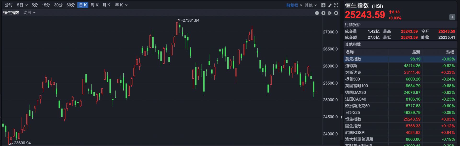 截至发稿,恒生指数报25243.59点,上涨8.18点,涨幅0.03%。