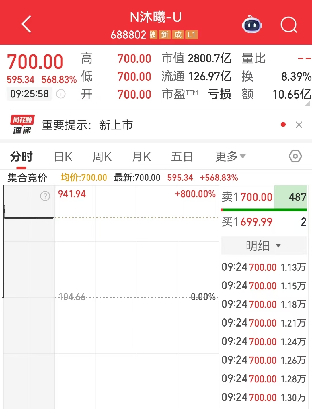 12月17日,沐曦股份(SH688802)竞价高开568%,股价报700元,总市值达2800亿元,单签盈利近30万元。